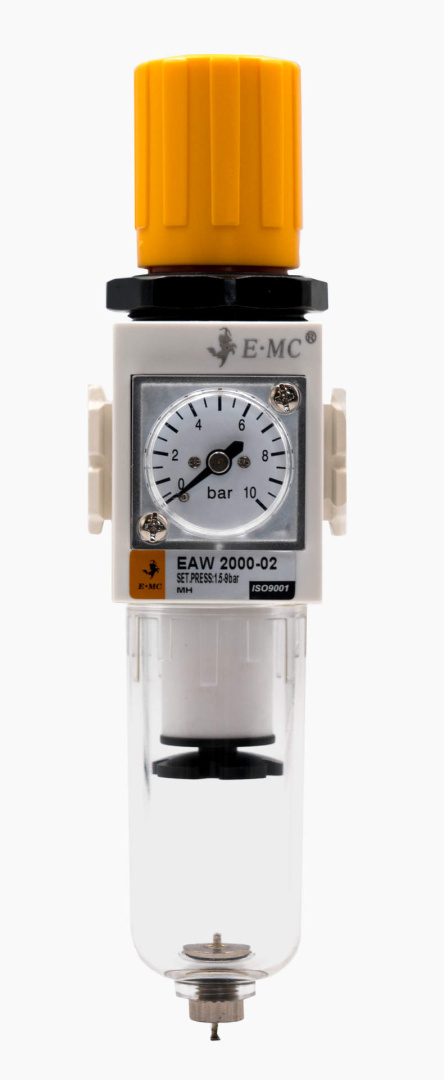 Фильтры-регуляторы давления – устройства подготовки сжатого воздуха, объединяющие в себе водосепаратор, грубый фильтр и регулятор давления. Как опция в него может входить манометр, тот или иной вид отвода конденсата, обратный клапан, защитный чехол для колбы, устройства фиксации настройки. Фильтры-регуляторы имеют такой же диапазон настройки рабочего давления, что и регуляторы, но в отличие от первых всегда монтируются вертикально.